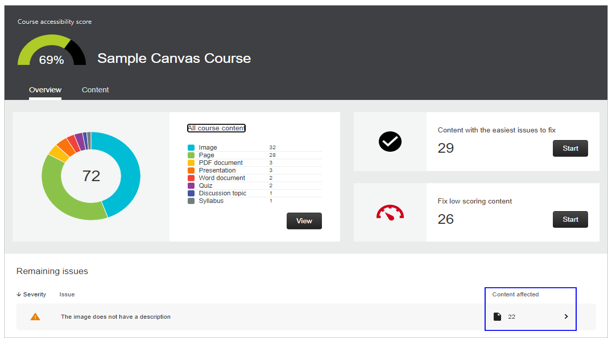 This may seem like an easy fix, and that’s because it is! But being an easy fix doesn’t make it any less important! Any student using assistive reading technology, such as a screen reader, relies on accurate and informative image descriptions to relay what a picture is showing. Missing Descriptions can occur for standalone images or within a document. The easiest way to add descriptions to the images in your course is to open your Ally Course Report, scan the list of accessibility issues, and locate content flagged with “The image does not have a description.”