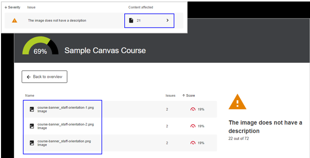 Once you click on the content affected, Ally provides a list of each image that needs attention.