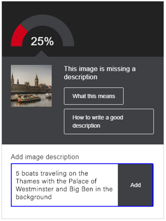 When you write an image description, avoid entering an image title or file name. Instead, give a brief description conveying the full meaning of the image. In this example, entering a title or file name for the image would fail to help students using assistive technology understand the content and context. Instead adding a more meaningful description would be “5 boats traveling on the Thames with the Palace of Westminster and Big Ben in the background.”