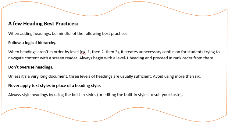 The proper use of heading styles is an easy way to improve the accessibility of course content. Headings help readers quickly scan sections of text and comprehend how content is organized. Students using assistive technology, like screen readers, depend on headings to navigate content. A common accessibility mistake is to style headings by adjusting the font size or applying boldface type, but screen readers don’t detect these variations as headings. For students with visual impairments, headings should always be applied using a program’s built-in heading styles.