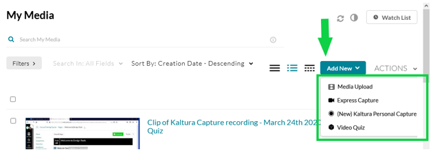 You can create new media in several ways via the Add New menu on the My Media page from within Kaltura.
