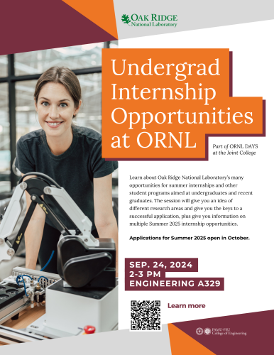 Undergraduate engineering students are invited to a presentation given by William Jenks of ORNL’s Office of Research Education to learn about ORNL’s many opportunities for summer internships and other student programs aimed at undergraduates and recent graduates. The session will give you an idea of different research areas and the keys to a successful application.